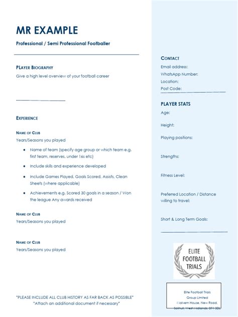 • Playing Profile: This is your game. Highlight your current club, any previous clubs, the positions you’ve played, and a brief description of your playing style. Use action words to make it come alive. For instance, instead of saying, “I played as a forward,” you could say, “Clinical finisher known for aggressive runs and goal-scoring ability.” This is where you tell them what you bring to the table. Think about what makes you a unique player. What are your strengths? What do you excel at? What makes you stand out from the crowd?