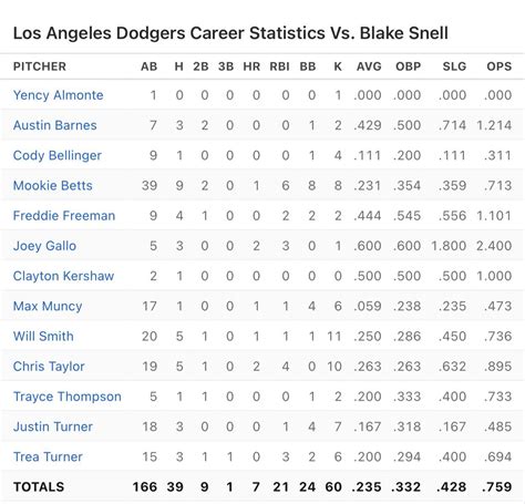 Let’s dive deep into Blake Snell’s performance against the Los Angeles Dodgers. Analyzing Snell’s stats against a potent lineup like the Dodgers can reveal a lot about his strengths, weaknesses, and overall effectiveness. We will explore various metrics to understand how he fares against this particular opponent. Understanding Blake Snell’s stats requires a comprehensive approach, considering factors like earned run average (ERA), strikeouts, walks, and opponent batting average. These statistics provide a foundational understanding of his performance, but further analysis into specific game situations and pitch types can offer a more nuanced perspective. Analyzing Blake Snell’s stats versus the Dodgers also necessitates examining the historical context. How has he performed against them over the years? Are there any noticeable trends or patterns? Has his approach changed, and if so, how has it impacted his results? Examining these historical data points adds depth to our analysis and helps us understand the trajectory of his performance. In addition to traditional stats, advanced metrics like FIP (Fielding Independent Pitching) and WHIP (Walks plus Hits per Inning Pitched) can offer valuable insights. FIP isolates a pitcher’s performance from the influence of fielding, providing a clearer picture of their true talent. WHIP, on the other hand, measures the number of baserunners a pitcher allows per inning, giving an indication of their ability to control the game. By combining traditional and advanced metrics, we gain a more complete understanding of Blake Snell’s stats and his performance against the Dodgers.
