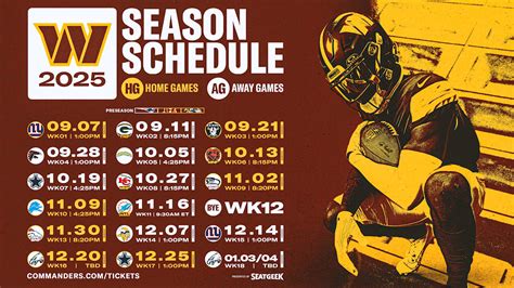With the release of the 2025 schedule , fan expectations are running high. Every fan has their own predictions for how the season will unfold. Some are optimistic, predicting a playoff run and perhaps even a Super Bowl appearance. Others are more cautious, tempering their expectations based on past disappointments and the perceived strength of the competition. Regardless of their individual predictions, all Commanders fans share a common hope: to see their team compete hard, play with passion, and ultimately achieve success. The schedule plays a significant role in shaping fan expectations. A favorable schedule, with a manageable mix of home and away games and a reasonable number of tough opponents, can fuel optimism. A challenging schedule, on the other hand, can lead to more tempered expectations. Early-season performance also has a major impact on fan sentiment. A strong start to the season can generate excitement and belief, while a slow start can lead to frustration and doubt. Social media provides a platform for fans to voice their opinions and share their predictions. Online forums and social media groups are filled with discussions about the schedule, the team’s strengths and weaknesses, and the likelihood of success. The media also plays a role in shaping fan expectations. Sportswriters and analysts offer their own predictions and insights, influencing the narrative surrounding the team. Ultimately, fan expectations are a reflection of their passion for the team and their desire to see them succeed. While predictions may vary, the underlying hope remains the same: to witness a winning season and celebrate the Commanders’ accomplishments. So, Commanders fans, let your voices be heard! Share your predictions, express your hopes, and rally behind your team. The 2025 season promises to be an exciting journey, and your support will be crucial to the Commanders’ success.