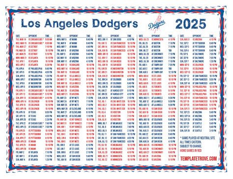 Alright, guys, let’s get down to business: the 2025 Dodgers schedule . This is the bread and butter of our planning, the blueprint for all the fun to come. While the official schedule isn’t usually released this far in advance, we can make some educated guesses and look at historical patterns. Typically, Major League Baseball (MLB) releases the full schedule for the following season in the late summer or early fall. Keep your eyes peeled around August or September of 2024 for the official announcement. Until then, we can anticipate a schedule that follows the standard MLB format, which includes 162 regular season games. Expect the season to kick off in late March or early April, with the Dodgers likely playing a mix of home and away games against their National League West rivals – the San Francisco Giants, San Diego Padres, Arizona Diamondbacks, and Colorado Rockies.