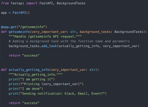 object available in your route’s dependency. It’s like handing off a chore to a helpful assistant who takes care of it while you get back to more important things. You can add multiple tasks, and FastAPI will queue them up to run. This pattern is fantastic for tasks like sending welcome emails to new users, generating reports, updating search indexes, or any other operation that doesn’t need to be completed before the user gets their immediate feedback. It’s a core feature for building responsive and scalable web applications. But, as we’ll soon see, just because the task runs