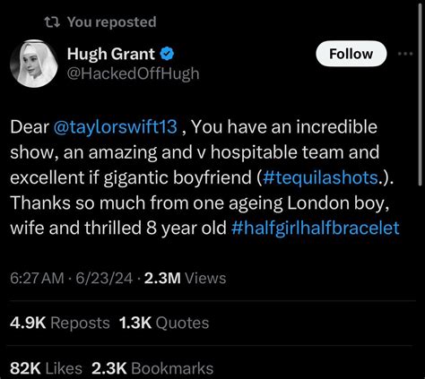 Hey everyone! You guys are not going to believe this, but Hugh Grant , the legendary actor we all know and love, has been absolutely singing the praises of none other than Taylor Swift on Twitter! Seriously, the internet is buzzing, and for good reason. It’s not every day you see a seasoned Hollywood icon like Grant giving such a glowing endorsement to a pop superstar like Swift, especially on a platform as public and, let’s be honest, sometimes brutal as Twitter. This whole situation has got me thinking about the power of social media, the impact of celebrity endorsements, and what it truly means when someone of Hugh Grant’s stature speaks so highly of another artist. We’re talking about a guy who’s been in the game for decades, seen it all, and usually keeps his cards pretty close to his chest when it comes to public opinions on fellow entertainers. So, when he decides to hop on his platform and drop some serious love for Taylor Swift, you know it’s got to be something special. It’s more than just a casual “like” or a retweet; this is a full-blown, public declaration of admiration from one respected figure to another. This kind of buzz doesn’t just happen; it signifies a genuine connection or a deep appreciation for the work being done. And let’s face it, Taylor Swift is always doing something – whether it’s dropping a new album, breaking records, or embarking on yet another epic world tour that has fans scrambling for tickets. So, what exactly did Hugh Grant say, and why is it causing such a stir? Grab your popcorn, guys, because we’re about to dive deep into this delightful celebrity interaction.