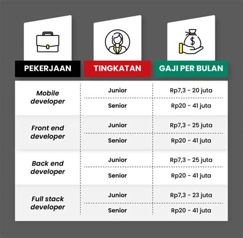 Perlu dicatat bahwa kisaran gaji ini bersifat umum dan dapat bervariasi berdasarkan faktor-faktor lain seperti lokasi, keterampilan khusus, dan jenis perusahaan. Developer dengan keterampilan khusus atau yang bekerja di perusahaan teknologi terkemuka cenderung mendapatkan gaji yang lebih tinggi. Untuk memaksimalkan potensi penghasilan, developer perlu terus meningkatkan keterampilan, mengikuti tren teknologi terbaru, dan membangun portofolio proyek yang kuat.