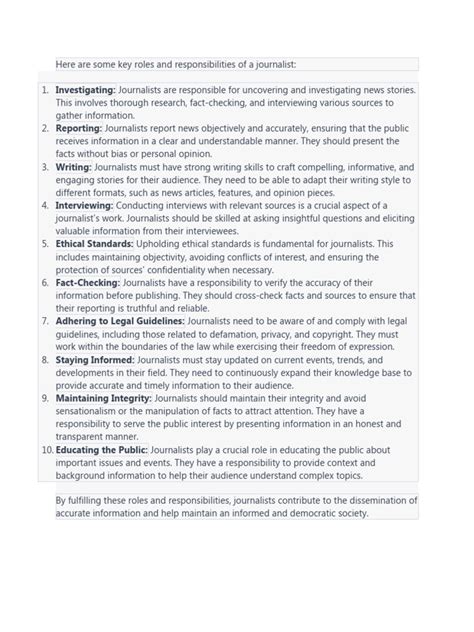 Furthermore, the responsibilities of a journalist are immense. They are tasked with upholding ethical standards, verifying information, and avoiding conflicts of interest. A journalist must be impartial and unbiased, presenting all sides of a story without injecting personal opinions or beliefs. They must also be accountable for their work, correcting errors promptly and transparently. In a world filled with misinformation and fake news, the role of the journalist as a trusted source of information is more important than ever. They are the gatekeepers of truth, helping the public navigate the complexities of the modern world and make informed decisions.
