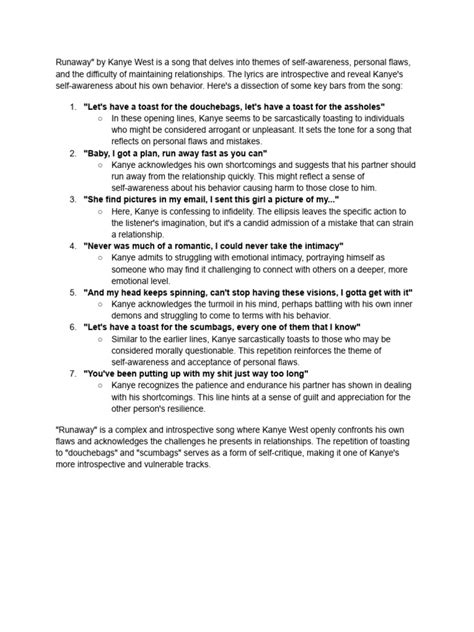 What makes the Kanye West “Runaway” sample so incredibly powerful is how it functions not just as a musical element, but as a crucial narrative tool. Seriously, guys, it’s like Kanye is using the sample as a voice from within, a reflection of the song’s core themes. “Runaway” is an intensely personal track, dealing with themes of self-sabotage, ego, and the desire for a fresh start, often after making significant mistakes. The sampled vocal, originally a plea from “Will You Be My Woman,” takes on a new meaning within the context of “Runaway.” It becomes the embodiment of the protagonist’s internal struggle. Is it a plea for forgiveness? A recognition of a destructive pattern? Or maybe a desperate attempt to hold onto something, even as everything else falls apart? The repetition of the sample, its haunting quality, perfectly mirrors the cyclical nature of regret and the difficulty of breaking free from one’s own flaws. It’s that feeling of being stuck, of repeating the same mistakes, that the “Runaway” sample so brilliantly captures. Kanye isn’t just adding a cool sound; he’s using this piece of existing music to add layers of meaning and emotional depth to his own lyrical narrative. It’s like a recurring motif in a film, a visual cue that reminds you of a central theme. In “Runaway,” the sample is that sonic cue. It’s the ghost of past actions haunting the present. This artistic transformation of the “Runaway” sample allows it to transcend its original context and become a universal expression of inner turmoil. It’s a brilliant stroke of genius that elevates the song from a personal confession to a relatable anthem for anyone who’s ever felt lost or out of control. The Kanye West “Runaway” sample isn’t just a background element; it’s a central character in the song’s emotional landscape, constantly reminding the listener of the weight of the themes being explored. It’s a masterclass in how to use sampling to enhance storytelling and create a truly immersive listening experience.