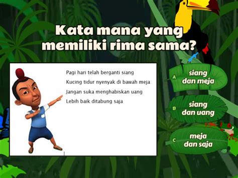 Nah, ini agak jarang banget di pantun tradisional, tapi penting buat kalian yang suka eksplorasi. Rima dalam itu maksudnya ada persamaan bunyi di tengah-tengah baris, atau antara tengah baris dengan akhir baris. Kadang, ini bisa bikin pantun jadi lebih kaya secara musikalitas, tapi juga bisa bikin pusing kalau nggak pas. Di pantun modern atau puisi yang terinspirasi pantun, kadang elemen ini dimasukkan.