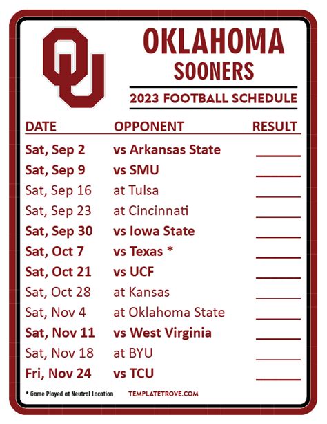 Having a physical copy of the schedule is great for keeping track of game dates and times, especially if you prefer not to rely solely on digital calendars. You can post it on your fridge, keep it in your sports binder, or bring it with you to games. With the schedule readily available, you’ll be well-prepared to support the Sooners throughout the season.