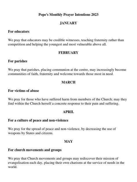 Hey everyone! Looking for some inspiration and guidance this year? Pope Francis has been a beacon of hope and a source of wisdom for so many of us, and his monthly prayer intentions are a fantastic way to connect with him and the wider Catholic community. This year, the Pope has some truly powerful intentions that are really close to his heart. These are things that he wants us all to think about, pray for, and, where possible, act upon . Let’s dive into what Pope Francis is asking us to pray for each month of 2023 and how we can bring those intentions into our daily lives. This isn’t just about reciting prayers, guys. It’s about being mindful of global issues, showing compassion, and striving to be better people. We are going to explore the monthly themes, breaking down the key areas and providing some food for thought on how we can all participate.