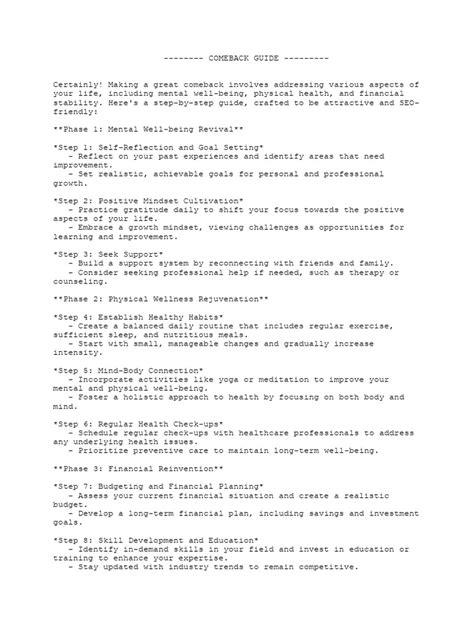 Making a comeback is one thing, but sustaining that momentum and ensuring long-term success is an entirely different ballgame. It’s not enough to just get back in the game; you need to stay there and thrive. This requires ongoing effort, self-awareness, and a commitment to continuous improvement. First and foremost, don’t get complacent . Just because you’ve achieved your initial comeback goals doesn’t mean you can rest on your laurels. The world keeps moving, and so should you. Always be looking for ways to grow, learn, and innovate. Continue to build and nurture your network . Strong relationships are vital for long-term success. Regularly connect with mentors, colleagues, and friends who can offer support, insights, and new opportunities. Prioritize self-care . Burnout is a real threat, especially when you’re working hard to maintain your position. Make sure you’re getting enough rest, exercise, and time for activities you enjoy. A healthy mind and body are essential for sustained performance. Reflect and adapt . Regularly take stock of your progress. What’s working well? What could be improved? Be willing to adjust your strategies as needed. The landscape might change, and you need to be flexible enough to adapt. Stay true to your values . As you find success, it’s important to remember what’s truly important to you. Don’t compromise your integrity or your core beliefs for short-term gains. This authenticity will build lasting trust and respect. Celebrate your wins, big and small . Acknowledging your achievements, both major milestones and minor successes, helps to reinforce positive behavior and keep motivation high. It’s a reminder of how far you’ve come. Always keep learning . The most successful people are lifelong learners. Stay curious, seek out new knowledge, and embrace opportunities for personal and professional development. Long-term success isn’t a destination; it’s a continuous journey. By focusing on these principles, you can ensure that your comeback isn’t just a temporary resurgence but a lasting transformation, proving that you’re not just back, but better than ever.