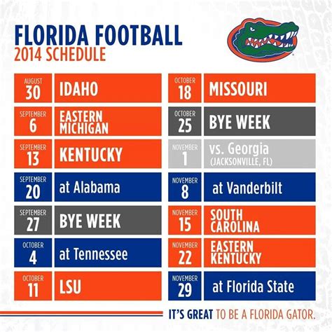 In today’s digital age, it might seem a bit old-fashioned to print out a schedule. However, there are several compelling reasons why having a printable UF Gator football schedule is a fantastic idea. First and foremost, it provides a tangible, easy-to-access reference that you can stick on your fridge, in your office, or anywhere else you’ll see it regularly. No need to fumble with your phone or tablet every time you want to check the game time or opponent. Secondly, a printable schedule is perfect for planning. Tailgate parties, watch parties, travel arrangements – all become easier when you have a clear, concise schedule in front of you. You can mark down important dates, jot down notes about each game, and even use it to track your predictions for the season. Moreover, a printable schedule is a great way to get the whole family involved. Kids love coloring in the logos of the teams the Gators will be facing, and it can be a fun way to teach them about the sport. Finally, let’s be honest, there’s something satisfying about physically crossing off each game as the season progresses. It’s a visual representation of the journey, and it adds an extra layer of excitement to the entire experience. So, ditch the digital clutter and embrace the simplicity and convenience of a printable schedule. It’s a small thing that can make a big difference in how you follow and enjoy the UF Gator football season.